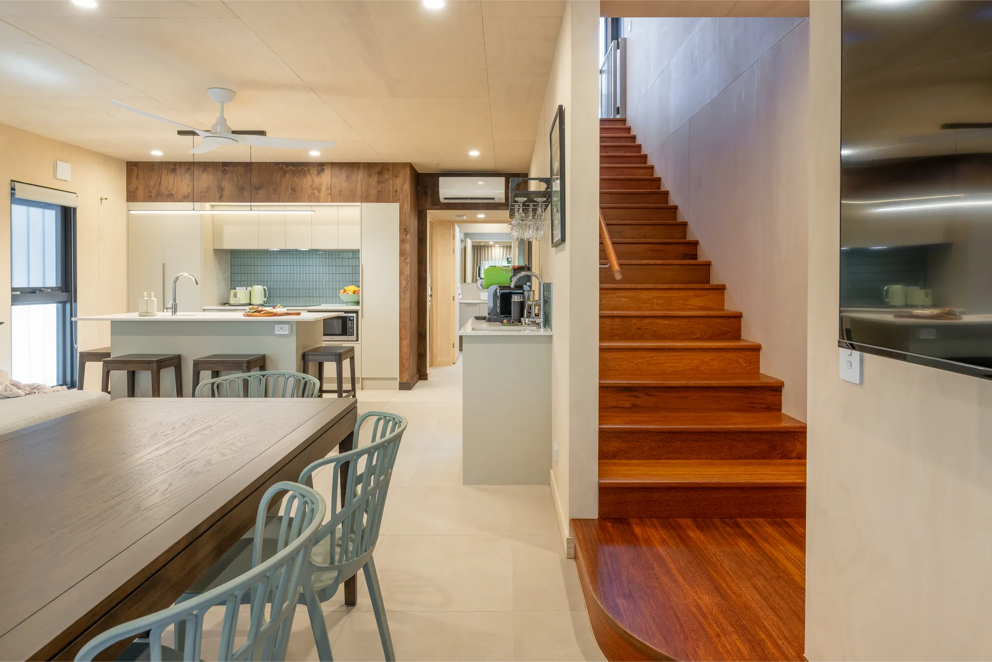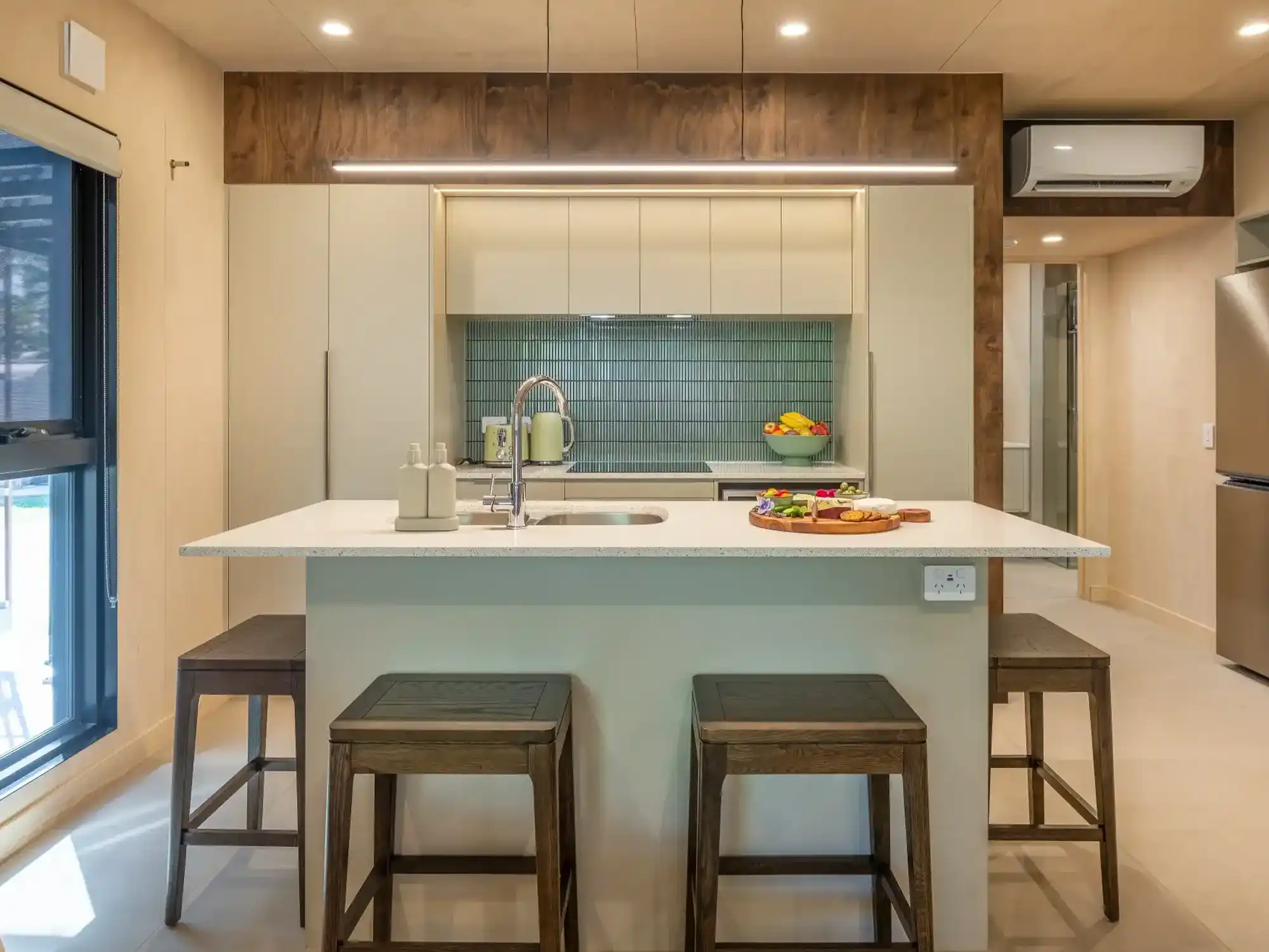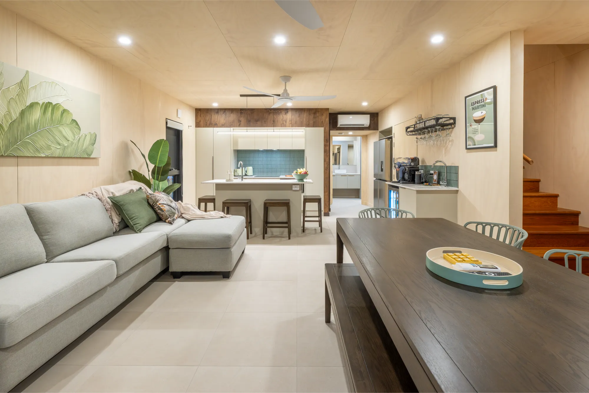 Partnering with ModnPods has been an exciting step forward for Ashmore Palms Holiday Village. Our new two-storey, three-bedroom, three-bathroom Paradise Penthouse modular accommodation is unlike anything we’ve ever introduced — designed to sleep up to ten guests, with striking interiors that truly reflect the spirit of Ashmore Palms.