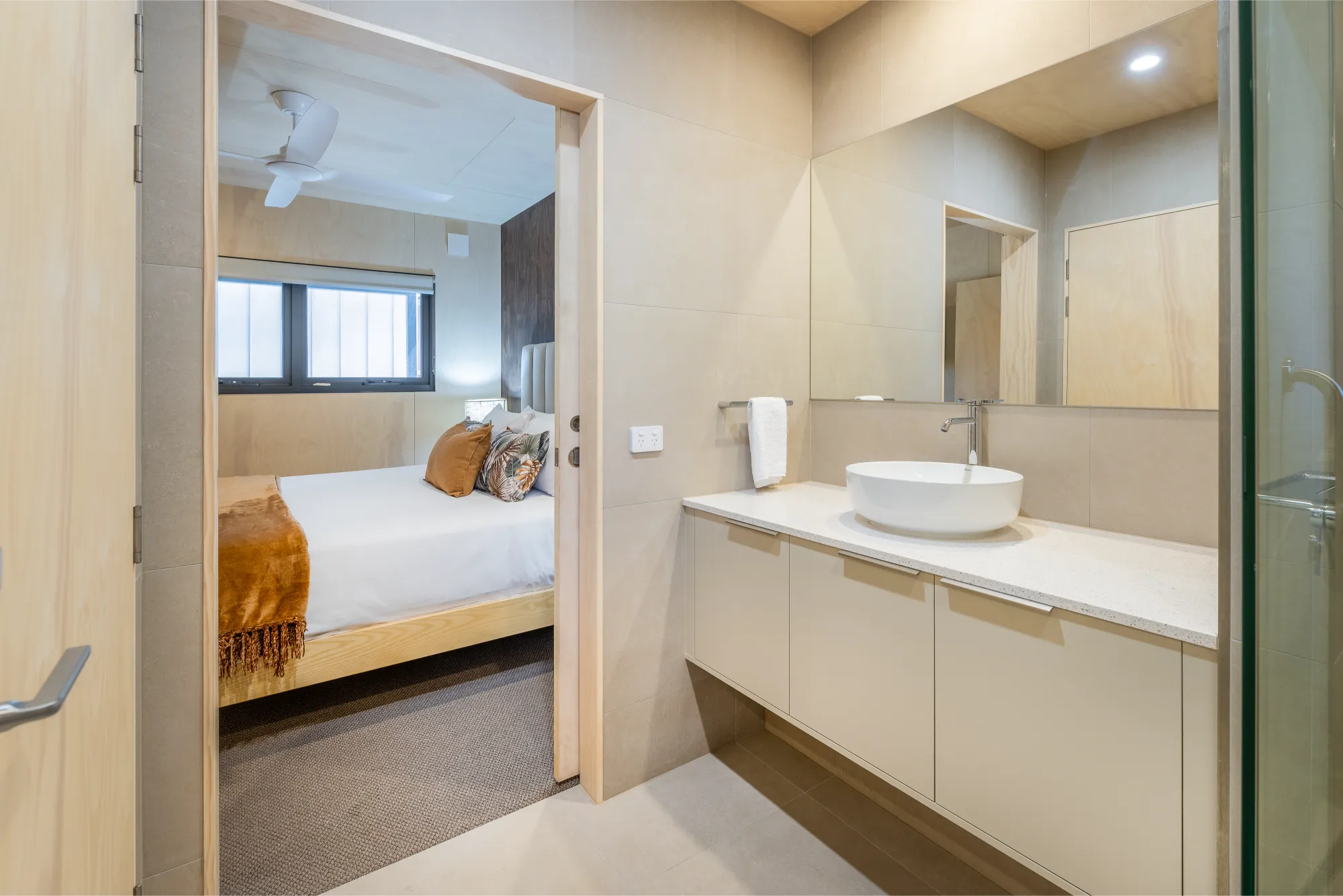 Fulton Trotter supported the client through an ACCPA grant application and managed the EOI and tender process. ModnPods were the successful team, and their delivery was excellent — their model is sharp, well-engineered, with beautifully detailed cladding and warm stained ply interiors. Both in the factory and on-site, their motivated team worked collaboratively to achieve a fantastic outcome.
