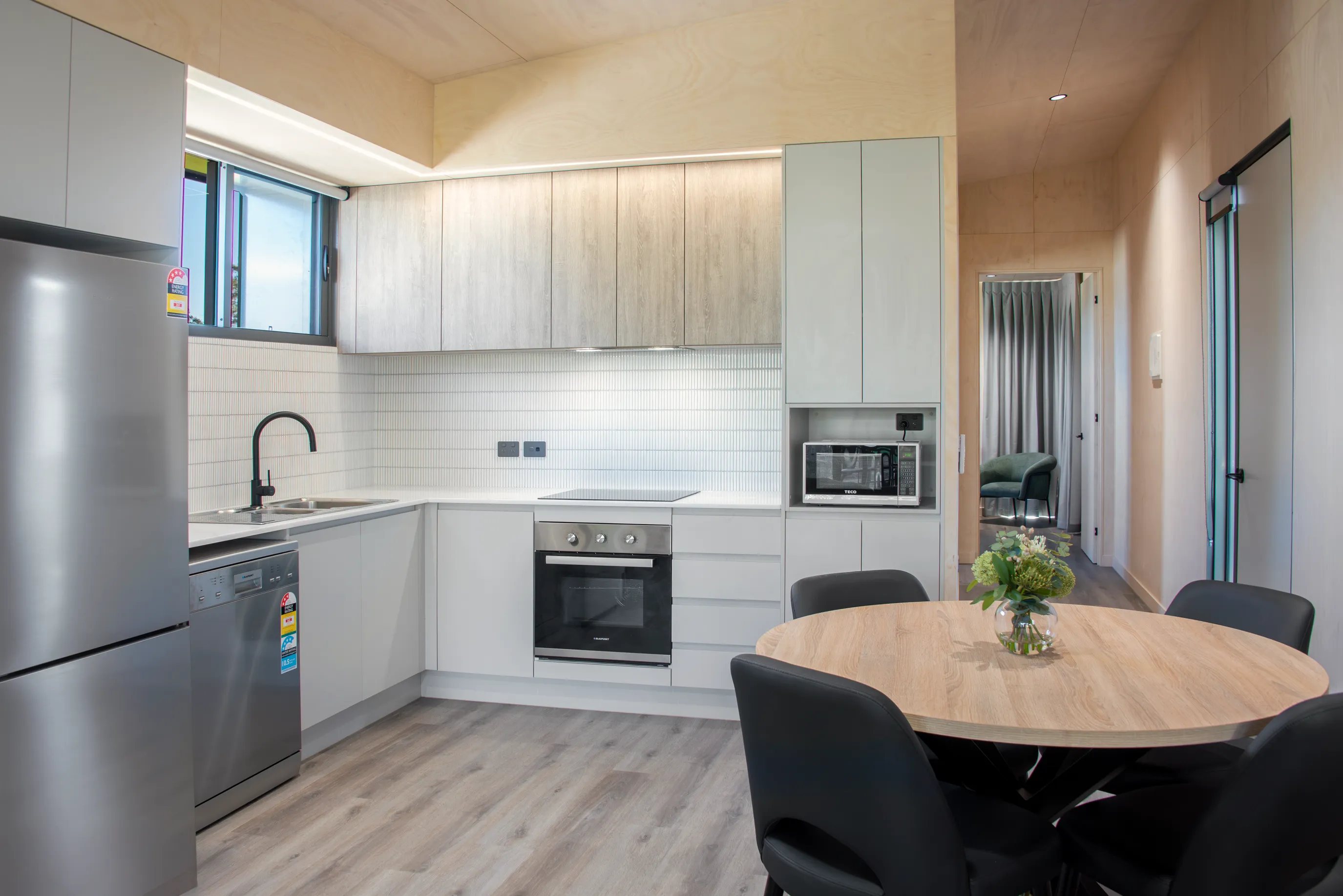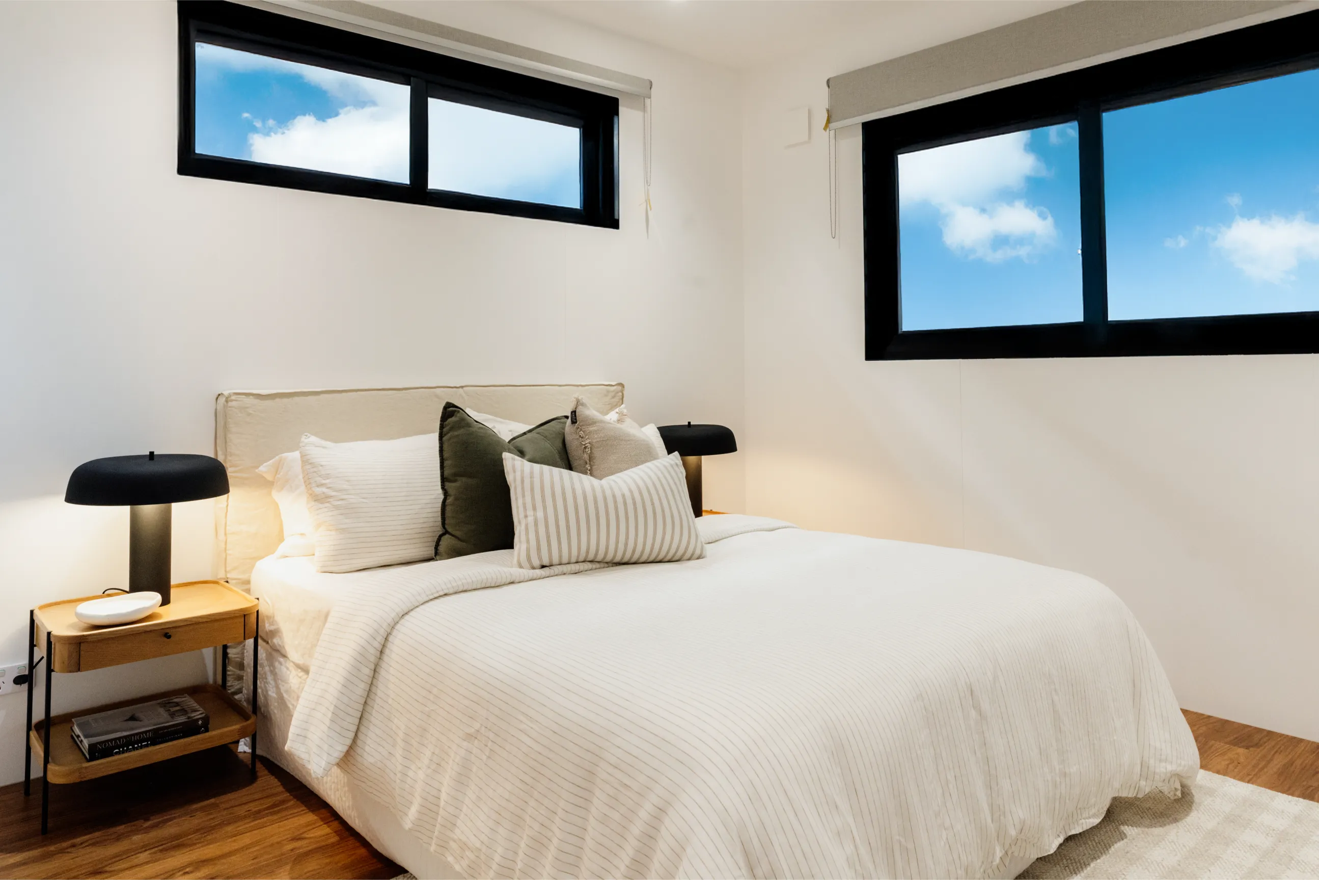 Each house is manufactured in our 6.300m2 integrated manufacturing facility on the Gold Coast, where design, manufacturing, and finishing all happen under one roof. Each housing solution is designed for comfort and efficiency, with ensuite options as well as modern and durable amenities to ensure long-term performance. This includes building everything from internal walls, flooring, and cabinetry to pre-installed plumbing and electrical systems. By the time the pod arrives on-site, it’s 90–95% complete, allowing for rapid installation, reliable timelines, and repeatable outcomes at scale.
