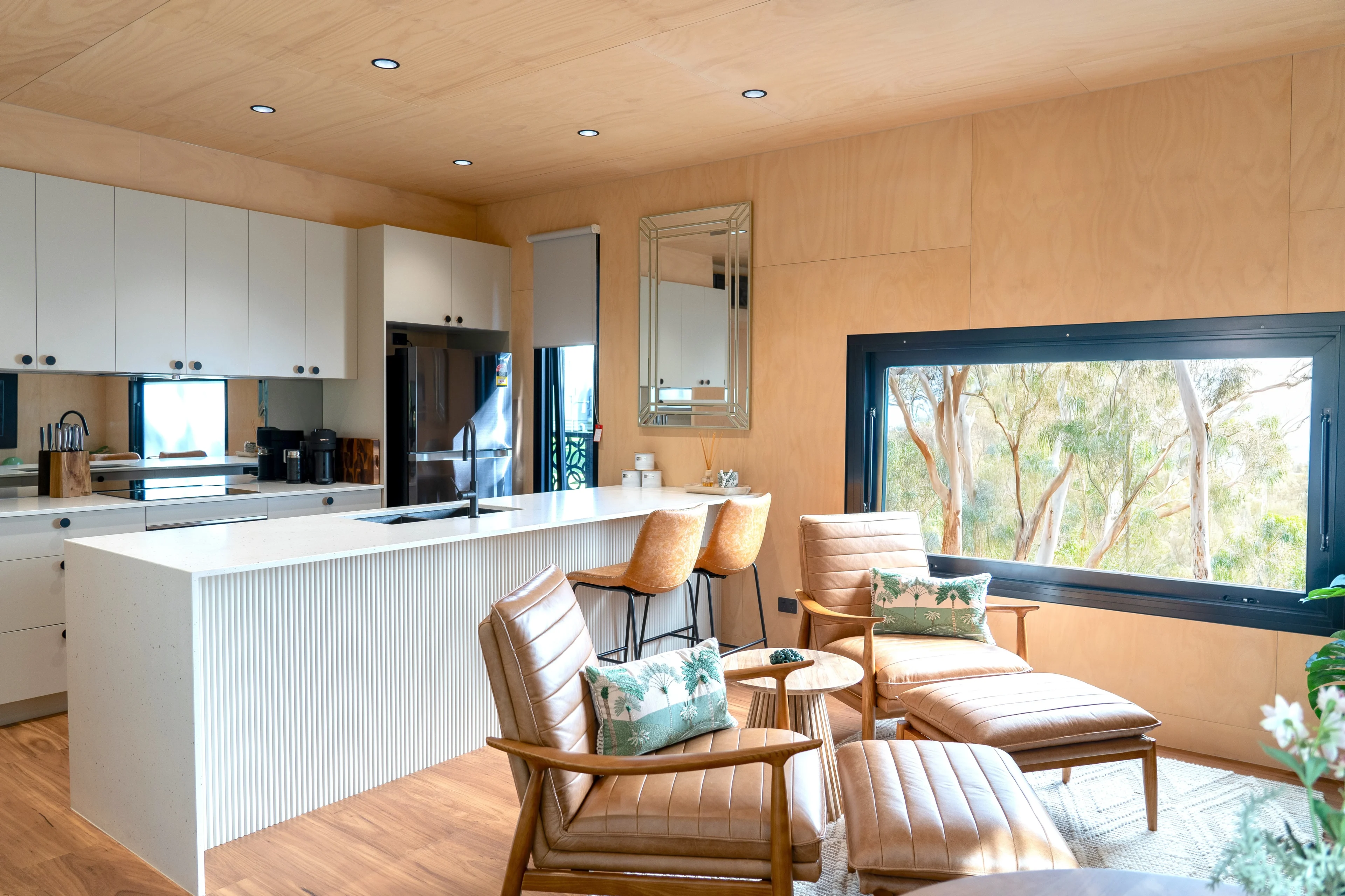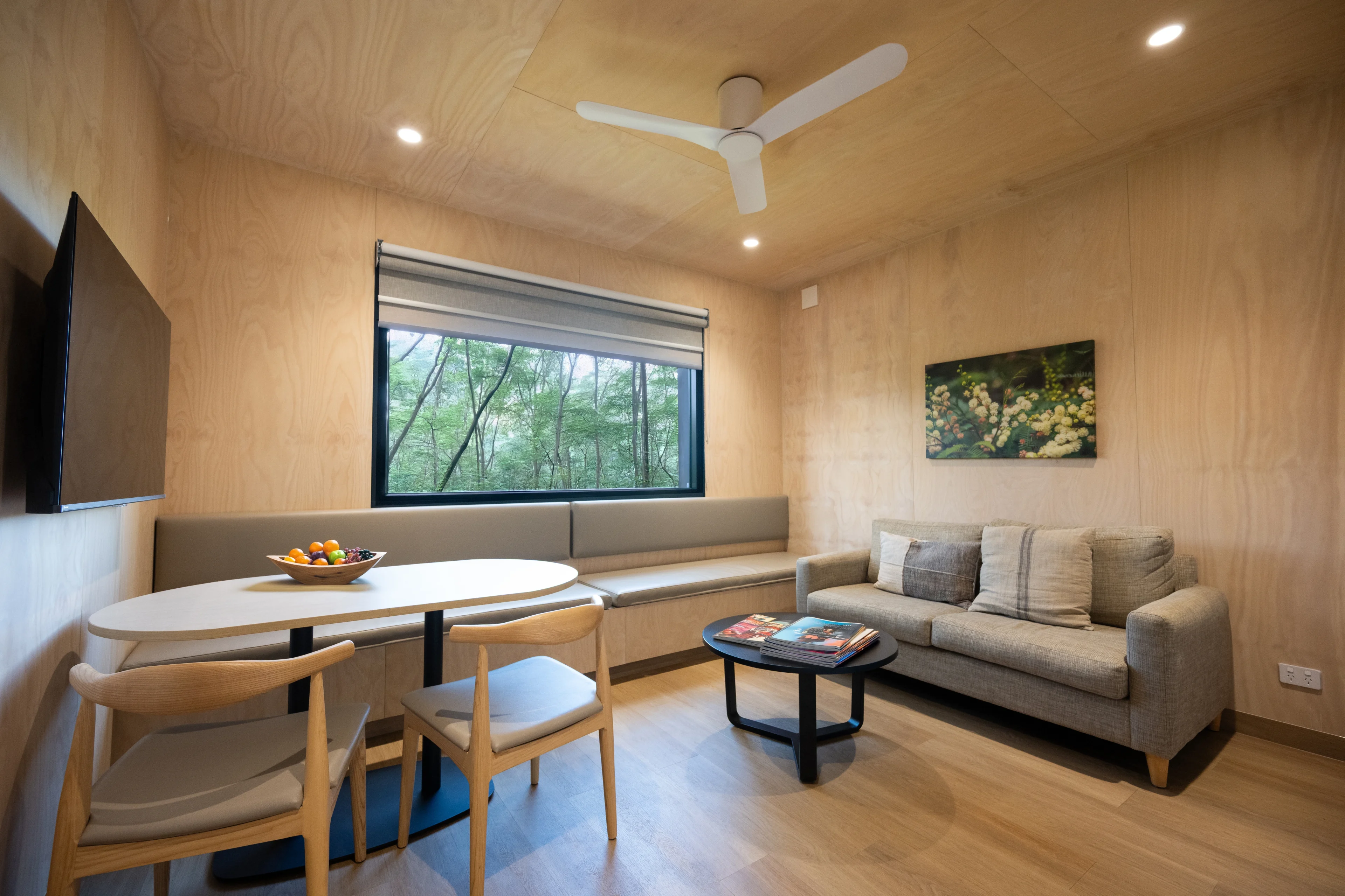 Fulton Trotter supported the client through an ACCPA grant application and managed the EOI and tender process. ModnPods were the successful team, and their delivery was excellent — their model is sharp, well-engineered, with beautifully detailed cladding and warm stained ply interiors. Both in the factory and on-site, their motivated team worked collaboratively to achieve a fantastic outcome.